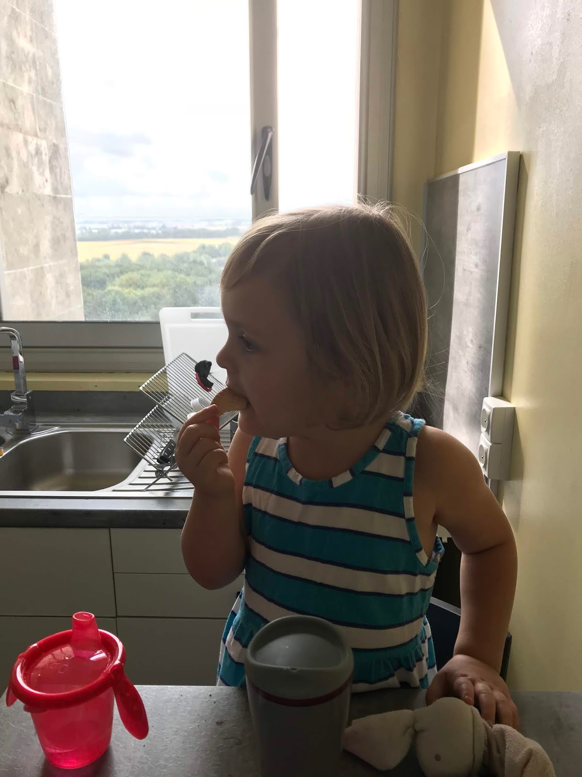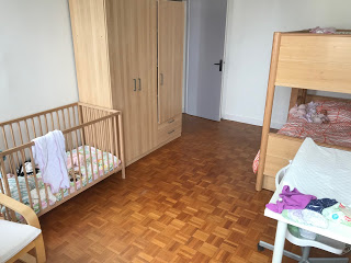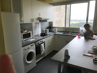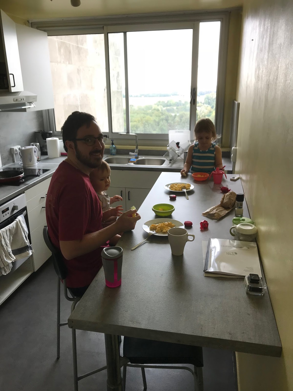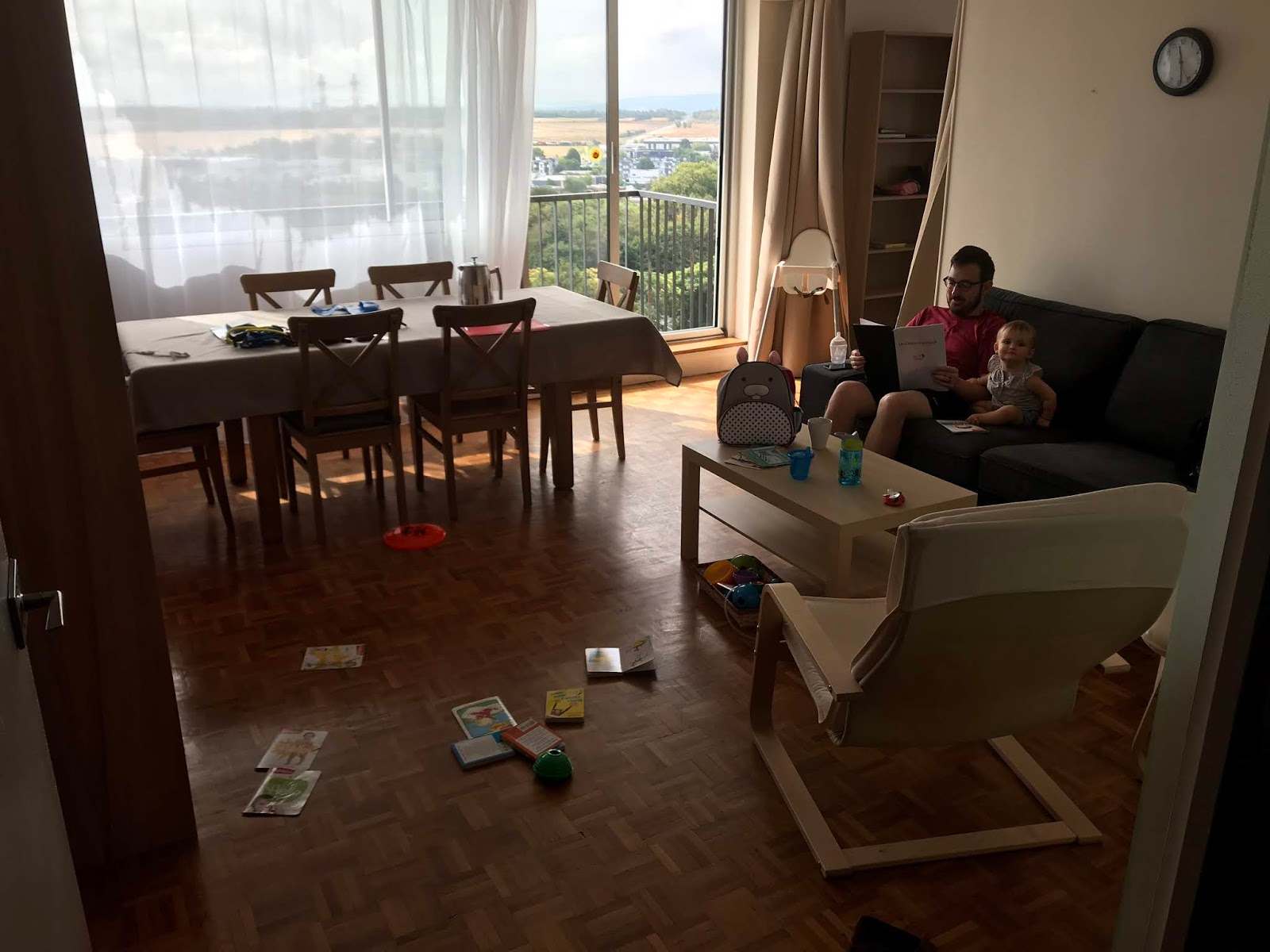 (Our living room/dining room with a beautiful view! We are very close to the Orly airport so Amelia has constant entertainment watching the planes coming and going!)