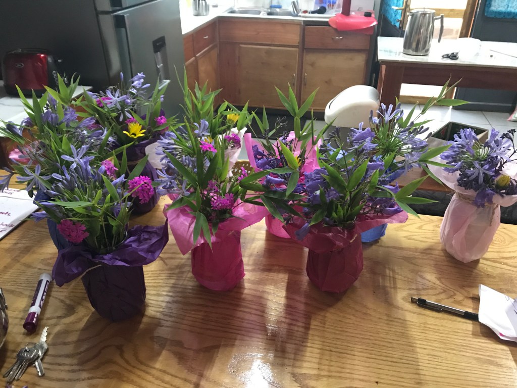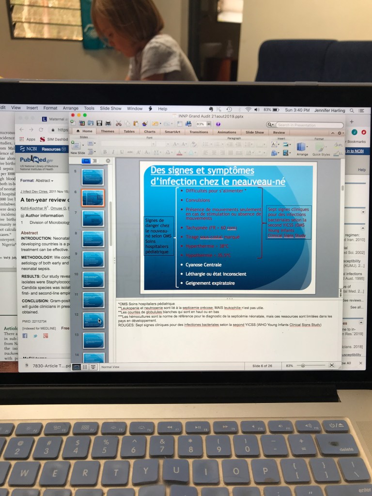 This is a picture inside of our grocery store that is a 30 min car ride away. Since we can’t drive yet in the country, it takes a lot of coordination to even get to the store! There are about 4 isles like this, and that’s about it! We go “shopping” about once every 6-8 weeks and stock up! We do get fresh, local produce, eggs, and milk on a weekly basis! We put in our market order on Tuesday, one of our team members tallies up all the orders, gives the large communal order to a local Burundian who goes to the market to buy everything, brings it back, and our individual orders are brought to our house in these huge baskets! This is an example of a weekly order (although I somehow ended up with someones cucumbers accidentally so I had to return those to their rightful owner!). Not pictured are our potatoes, onions, garlic, and 35 tomatoes! Why so many potatoes and eggs? Everything is from scratch. The dark fruit in the bottom of the basket are passion fruits. Don’t you love the cute snack-sized bananas?? There are about 10-15 other items (peanuts, eggplant, sweet potatoes, mangoes, oranges, etc) that I don’t get on a weekly basis but that are also available!Learning how to round on the malnutrition inpatient unit was (and still IS) a STEEP learning curve. This is an example of a daily note – “Le 15/7/19, j3 dh APS + TD, GEANF, MAS. S/ Ampi/Genta j3, Art j3, F75. CAT: seroretro par la mère.” Literally translated in French means “Le 15 de juliet 2019, jour 3 de hospitalization, accès paludisme simple plus trouble digestive, gastroenterite aigue non-febrile, malnutrition aigue severe. sous ampicilline et gentamicine jour trois, artusinate jour trois, et F75. Conduite a tenir. Seroretro par la mère” And in English means the 15th of July 2019, day 3 of hospitalization, simple malaria plus gastrointestinal complications, acute non-febrile gastroenteritis, acute severe malnutrition. Meds: ampicillin and gentamicin day 3, artusinate day 3, and F75 (a special formula for severely malnourished children). Plan: test mother for HIV. Crackers with olive oil, salt, pepper, and turmeric.We make pizza every Friday night. Our house helper makes the dough and the sauce, Michael rolls out/tosses the dough and adds the toppings and cheese! The meat comes from a butcher in the capital 3 hours away (!!) and the green pepper came from our produce order. I gave grand rounds about early onset neonatal sepsis! Playing in the dirt…again. ◡̈ What do you do when you need centerpieces for a going away party and there are slim pickings? And a florist is hard to find/get to. Bamboo shoots for greenery, purple flowers from trees and a few remaining blooming bushes, and a few pink and yellow flowers from our flower beds in our yard placed in mayonnaise jars covered in tissue paper from a friend! Voila! Michael in the OR with a medical student from Harvard. I helped tach a course called “helping babies breathe” to local healthcare workers. This is an arial view of Kibuye Hope Hospital. It’s grown a lot in the past five years! Michael and I walk across the field in the lower part of the picture to get to work each day. It’s about a quarter mile walk. I (Jenn) am usually accompanied by goats!